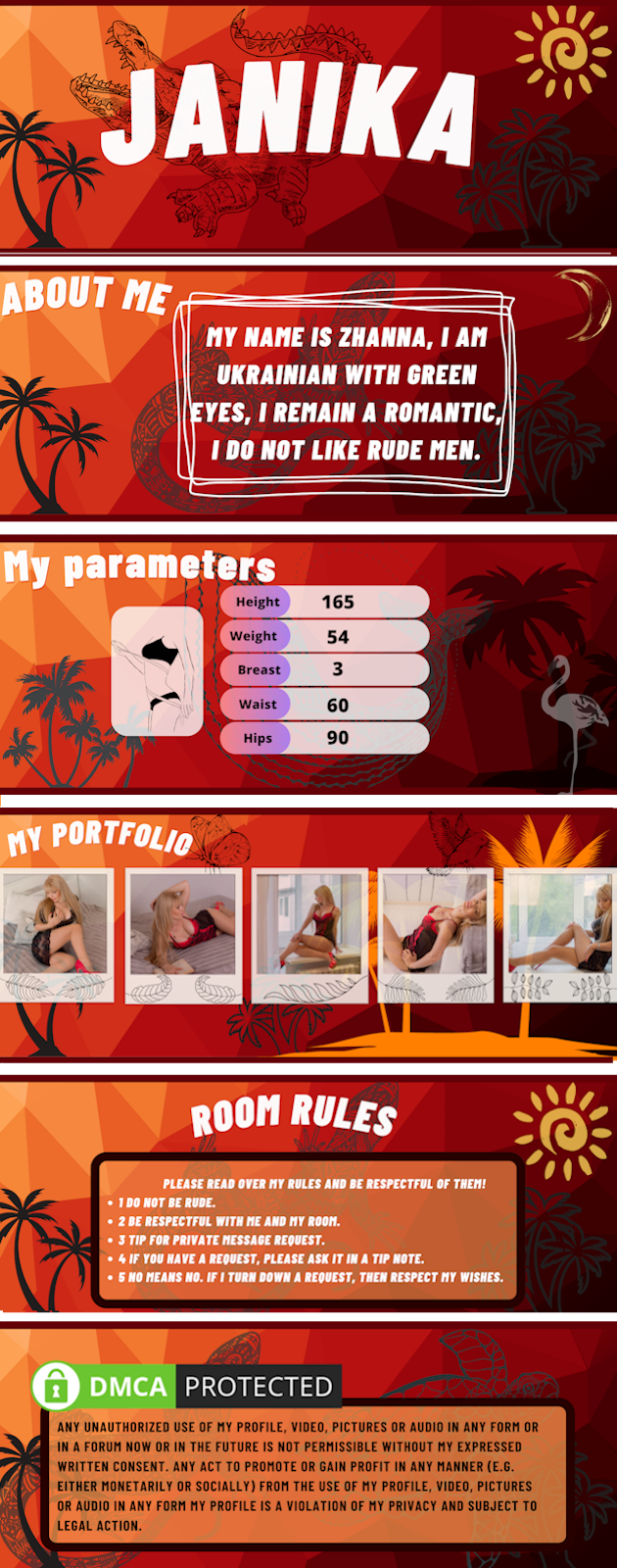 You can ASK FOR A DATE with Janika at your convenience. Everything is in your timezone, your local hours. She will receive your request and accept it if her schedule is free. You will receive a confirmation via email and you can prepare for your hot experience.
